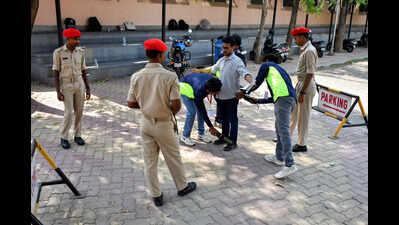 Ranchi, Apr 19 (ANI): Security personnel check the JPSC aspirants with a metal detector before they enter the exam hall, in Ranchi on Sunday. (ANI Photo)